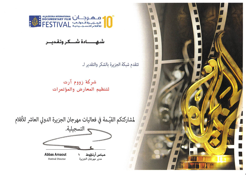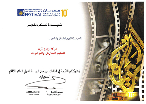 Zoom would like to thank the organizing committee of Al Jazeera International Documentary Film Festival for choosing Zoom to work with during their prestigious event and for the Appreciation Certificate issued to us.