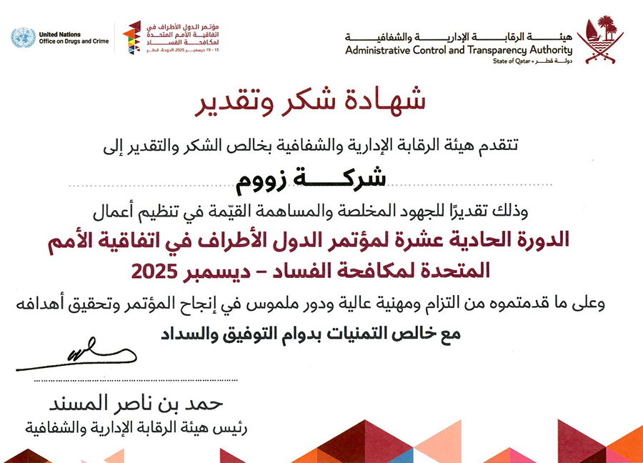 Zoom Arts & Design Receives UN Certificate of Appreciation at the Conference of the States Parties to the UN Convention against Corruption (COSP11), Doha 2025